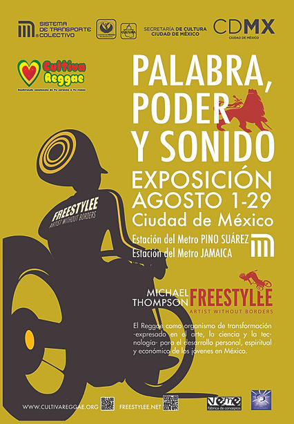 Exposición del multipremiado artista gráfico jamaicano Michael Thompson, que ha presentado su obra en importantes espacios culturales de ciudades alrededor del mundo como Berlin, Alemania; Dublin, Irlanda; Birmingham, Inglaterra; Benicasim, España; Kingston, Jamaica; y varios lugares de Estados Unidos, llega por primera vez a la Ciudad de México presentando totalmente abierta al público la exposición historica de Reggae PALABRA, PODER y SONIDO.
